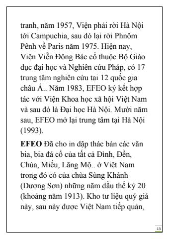 13tranh, n%u0103m 1957, Vi%u1ec7n ph%u1ea3i r%u1eddi H%u00e0 N%u1ed9i t%u1edbi Campuchia, sau %u0111%u00f3 l%u1ea1i r%u1eddi Phn%u00f4m P%u00eanh v%u1ec1 Paris n%u0103m 1975. Hi%u1ec7n nay, Vi%u1ec7n Vi%u1ec5n %u0110%u00f4ng B%u00e1c c%u1ed5 thu%u1ed9c B%u1ed9 Gi%u00e1o d%u1ee5c %u0111%u1ea1i h%u1ecdc v%u00e0 Nghi%u00ean c%u1ee9u Ph%u00e1p, c%u00f3 17 trung t%u00e2m nghi%u00ean c%u1ee9u t%u1ea1i 12 qu%u1ed1c gia ch%u00e2u %u00c1.. N%u0103m 1983, EFEO k%u00fd k%u1ebft h%u1ee3p t%u00e1c v%u1edbi Vi%u1ec7n Khoa h%u1ecdc x%u00e3 h%u1ed9i Vi%u1ec7t Nam v%u00e0 sau %u0111%u00f3 l%u00e0 %u0110%u1ea1i h%u1ecdc H%u00e0 N%u1ed9i. M%u01b0%u1eddi n%u0103m sau, EFEO m%u1edf l%u1ea1i trung t%u00e2m t%u1ea1i H%u00e0 N%u1ed9i(1993).EFEO %u0110%u00e3 cho in d%u1eadp th%u00e1c b%u1ea3n c%u00e1c v%u0103n bia, bia %u0111%u00e1 c%u1ed5 c%u1ee7a t%u1ea5t c%u1ea3 %u0110%u00ecnh, %u0110%u1ec1n, Ch%u00f9a, Mi%u1ebfu, L%u0103ng M%u1ed9.. %u1edf Vi%u1ec7t Nam trong %u0111%u00f3 c%u00f3 c%u1ee7a ch%u00f9a S%u00f9ng Kh%u00e1nh (D%u01b0%u01a1ng S%u01a1n) nh%u1eefng n%u0103m %u0111%u1ea7u th%u1ebf k%u1ef7 20 (kho%u1ea3ng n%u0103m 1913). Kho t%u01b0 li%u1ec7u qu%u00fd gi%u00e1 n%u00e0y, sau n%u00e0y %u0111%u01b0%u1ee3c Vi%u1ec7t Nam ti%u1ebfp qu%u1ea3n,