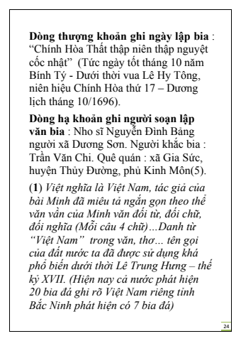 24D%u00f2ng th%u01b0%u1ee3ng kho%u1ea3n ghi ng%u00e0y l%u1eadp bia : %u201cCh%u00ednh H%u00f2a Th%u1ea5t th%u1eadp ni%u00ean th%u1eadp nguy%u1ec7t c%u1ed1c nh%u1eadt%u201d (T%u1ee9c ng%u00e0y t%u1ed1t th%u00e1ng 10 n%u0103m B%u00ednh T%u00fd - D%u01b0%u1edbi th%u1eddi vua L%u00ea Hy T%u00f4ng, ni%u00ean hi%u1ec7u Ch%u00ednh H%u00f2a th%u1ee9 17 %u2013 D%u01b0%u01a1ng l%u1ecbch th%u00e1ng 10/1696).D%u00f2ng h%u1ea1 kho%u1ea3n ghi ng%u01b0%u1eddi so%u1ea1n l%u1eadp v%u0103n bia : Nho s%u0129 Nguy%u1ec5n %u0110%u00ecnh B%u1ea3ng ng%u01b0%u1eddi x%u00e3 D%u01b0%u01a1ng S%u01a1n. Ng%u01b0%u1eddi kh%u1eafc bia : Tr%u1ea7n V%u0103n Chi. Qu%u00ea qu%u00e1n : x%u00e3 Gia S%u1ee9c, huy%u1ec7n Th%u1ee7y %u0110%u01b0%u1eddng, ph%u1ee7 Kinh M%u00f4n(5).(1) Vi%u1ec7t ngh%u0129a l%u00e0 Vi%u1ec7t Nam, t%u00e1c gi%u1ea3 c%u1ee7a b%u00e0i Minh %u0111%u00e3 mi%u00eau t%u1ea3 ng%u1eafn g%u1ecdn theo th%u1ec3v%u0103n v%u1ea7n c%u1ee7a Minh v%u0103n %u0111%u1ed1i t%u1eeb, %u0111%u1ed1i ch%u1eef, %u0111%u1ed1i ngh%u0129a (M%u1ed7i c%u00e2u 4 ch%u1eef)%u2026Danh t%u1eeb%u201cVi%u1ec7t Nam%u201d trong v%u0103n, th%u01a1%u2026 t%u00ean g%u1ecdi c%u1ee7a %u0111%u1ea5t n%u01b0%u1edbc ta %u0111%u00e3 %u0111%u01b0%u1ee3c s%u1eed d%u1ee5ng kh%u00e1 ph%u1ed5 bi%u1ebfn d%u01b0%u1edbi th%u1eddi L%u00ea Trung H%u01b0ng %u2013 th%u1ebfk%u1ef7 XVII. (Hi%u1ec7n nay c%u1ea3 n%u01b0%u1edbc ph%u00e1t hi%u1ec7n 20 bia %u0111%u00e1 ghi r%u00f5 Vi%u1ec7t Nam ri%u00eang t%u1ec9nh B%u1eafc Ninh ph%u00e1t hi%u1ec7n c%u00f3 7 bia %u0111%u00e1)