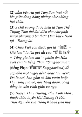 25(2) n%u1eb1m b%u00ean r%u00eca n%u00fai Tam S%u01a1n (n%u00fai n%u1ed5i l%u00ean gi%u1eefa %u0111%u1ed3ng b%u1eb1ng ph%u1eb3ng nh%u01b0 nh%u1eefng h%u1ea1t ch%u00e2u)(3) 3 ch%u1eef v%u01b0%u01a1ng %u0111%u01b0%u1ee3c hi%u1ec3u l%u00e0 Tam Th%u1ebf : T%u01b0%u1ee3ng Tam th%u1ebf %u0111%u1ea1i di%u1ec7n cho ch%u01b0 ph%u1eadt m%u01b0%u1eddi ph%u01b0%u01a1ng %u1edf ba th%u1eddi: Qu%u00e1 kh%u1ee9 - Hi%u1ec7n t%u1ea1i - T%u01b0%u01a1ng lai.(4) Ch%u00f9a Vi%u1ec7t c%u00f2n %u0111%u01b0%u1ee3c g%u1ecdi l%u00e0 %u201c%u4f3d%u85cd - Gi%u00e0 lam%u201d l%u00e0 t%u00ean g%u1ecdi t%u1eaft c%u1ee7a %u201c%u50e7%u4f3d%u85cd%u6469 - T%u0103ng gi%u00e0 lam ma%u201d - phi%u00ean %u00e2m H%u00e1n Vi%u1ec7t c%u1ee7a t%u1eeb ti%u1ebfng Ph%u1ea1n %u201cSangharama%u201d.(ti%u1ebfng Ph%u1ea1n: Sa%u1e43ghar%u0101ma) %u0111%u1ec1 c%u1eadp %u0111%u1ebfn m%u1ed9t \%u0110%u00f3 l%u00e0 n%u01a1i, bao g%u1ed3m c%u1ea3 khu v%u01b0%u1eddn ho%u1eb7c khu r%u1eebng c%u1ee7a n%u00f3, n%u01a1i T%u0103ng %u0111o%u00e0n, c%u1ed9ng %u0111%u1ed3ng tu vi%u1ec7n Ph%u1eadt gi%u00e1o c%u01b0 ng%u1ee5.(5) Huy%u1ec7n Th%u1ee7y %u0110%u01b0%u1eddng, Ph%u1ee7 Kinh M%u00f4n : thu%u1ed9c th%u1eeba tuy%u00ean H%u1ea3i D%u01b0%u01a1ng (1460).Th%u1eddi Nguy%u1ec5n vua %u0110%u1ed3ng Kh%u00e1nh (t%u00ean h%u00fay