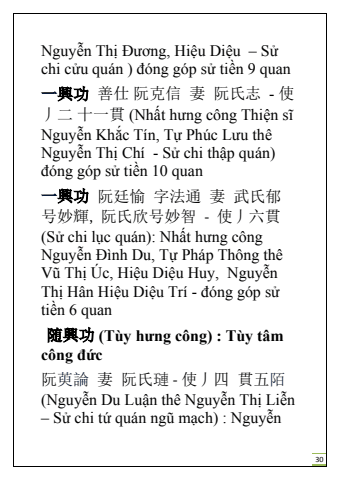 30Nguy%u1ec5n Th%u1ecb %u0110%u01b0%u01a1ng, Hi%u1ec7u Di%u1ec7u %u2013 S%u1eedchi c%u1eedu qu%u00e1n ) %u0111%u00f3ng g%u00f3p s%u1eed ti%u1ec1n 9 quan%u4e00%u8208%u529f %u5584%u4ed5 %u962e%u514b%u4fe1 %u59bb %u962e%u6c0f%u5fd7 - %u4f7f%u4e3f%u4e8c %u5341%u4e00%u8cab (Nh%u1ea5t h%u01b0ng c%u00f4ng Thi%u1ec7n s%u0129 Nguy%u1ec5n Kh%u1eafc T%u00edn, T%u1ef1 Ph%u00fac L%u01b0u th%u00ea Nguy%u1ec5n Th%u1ecb Ch%u00ed - S%u1eed chi th%u1eadp qu%u00e1n) %u0111%u00f3ng g%u00f3p s%u1eed ti%u1ec1n 10 quan%u4e00%u8208%u529f %u962e%u5ef7%u6109 %u5b57%u6cd5%u901a %u59bb %u6b66%u6c0f%u90c1%u53f7%u5999%u8f1d, %u962e%u6c0f%u6b23%u53f7%u5999%u667a - %u4f7f%u4e3f%u516d%u8cab(S%u1eed chi l%u1ee5c qu%u00e1n): Nh%u1ea5t h%u01b0ng c%u00f4ng Nguy%u1ec5n %u0110%u00ecnh Du, T%u1ef1 Ph%u00e1p Th%u00f4ng th%u00ea V%u0169 Th%u1ecb %u00dac, Hi%u1ec7u Di%u1ec7u Huy, Nguy%u1ec5n Th%u1ecb H%u00e2n Hi%u1ec7u Di%u1ec7u Tr%u00ed - %u0111%u00f3ng g%u00f3p s%u1eedti%u1ec1n 6 quan%u968f%u8208%u529f (T%u00f9y h%u01b0ng c%u00f4ng) : T%u00f9y t%u00e2m c%u00f4ng %u0111%u1ee9c%u962e%u8438%u8ad6 %u59bb %u962e%u6c0f%u7489 - %u4f7f%u4e3f%u56db %u8cab%u4e94%u964c(Nguy%u1ec5n Du Lu%u1eadn th%u00ea Nguy%u1ec5n Th%u1ecb Li%u1ec5n %u2013 S%u1eed chi t%u1ee9 qu%u00e1n ng%u0169 m%u1ea1ch) : Nguy%u1ec5n