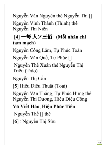 42Nguy%u1ec5n V%u0103n Nguy%u00ean th%u00ea Nguy%u1ec5n Th%u1ecb []Nguy%u1ec5n Vinh Th%u00e0nh (Th%u1ecbnh) th%u00ea Nguy%u1ec5n Th%u1ecb Ni%u00ean[4] %u4e00%u6bce %u4eba%u30bd%u4e09%u4f70 (M%u1ed7i nh%u00e2n chi tam m%u1ea1ch)Nguy%u1ec5n C%u00f4ng L%u00e2m, T%u1ef1 Ph%u00fac To%u00e0nNguy%u1ec5n V%u0103n Qu%u1ebf, T%u1ef1 Ph%u00fac []Nguy%u1ec5n Th%u1ebf Xu%u00e2n th%u00ea Nguy%u1ec5n Th%u1ecb Tri%u1ec1u (Tr%u00e0o)Nguy%u1ec5n Th%u1ecb C%u1ea9n[5] Hi%u1ec7u Di%u1ec7u Thu%u1eadt (To%u1ea1i)Nguy%u1ec5n V%u0103n Th%u1eafng, T%u1ef1 Ph%u00fac H%u01b0ng th%u00ea Nguy%u1ec5n Th%u1ecb D%u01b0%u01a1ng, Hi%u1ec7u Di%u1ec7u C%u00f4ngV%u0169 Vi%u1ebft H%u00e0o, Hi%u1ec7u Ph%u00fac Ti%u00eanNguy%u1ec5n Th%u1ebf [] th%u00ea[6] : Nguy%u1ec5n Th%u1ecb S%u1eedu