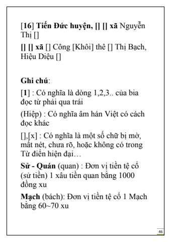 46[16] Ti%u1ebfn %u0110%u1ee9c huy%u1ec7n, [] [] x%u00e3 Nguy%u1ec5n Th%u1ecb [][] [] x%u00e3 [] C%u00f4ng [Kh%u00f4i] th%u00ea [] Th%u1ecb B%u1ea1ch, Hi%u1ec7u Di%u1ec7u []Ghi ch%u00fa:[1] : C%u00f3 ngh%u0129a l%u00e0 d%u00f2ng 1,2,3.. c%u1ee7a bia %u0111%u1ecdc t%u1eeb ph%u1ea3i qua tr%u00e1i(Hi%u1ec7p) : C%u00f3 ngh%u0129a %u00e2m h%u00e1n Vi%u1ec7t c%u00f3 c%u00e1ch %u0111%u1ecdc kh%u00e1c[],[x] : C%u00f3 ngh%u0129a l%u00e0 m%u1ed9t s%u1ed1 ch%u1eef b%u1ecb m%u1edd, m%u1ea5t n%u00e9t, ch%u01b0a r%u00f5, ho%u1eb7c kh%u00f4ng c%u00f3 trong T%u1eeb %u0111i%u1ec3n hi%u1ec7n %u0111%u1ea1i%u2026S%u1eed - Qu%u00e1n (quan) : %u0110%u01a1n v%u1ecb ti%u1ec1n t%u1ec7 c%u1ed5(s%u1eed ti%u1ec1n) 1 x%u00e2u ti%u1ec1n quan b%u1eb1ng 1000 %u0111%u1ed3ng xuM%u1ea1ch (b%u00e1ch): %u0110%u01a1n v%u1ecb ti%u1ec1n t%u1ec7 c%u1ed5 1 M%u1ea1ch b%u1eb1ng 60~70 xu