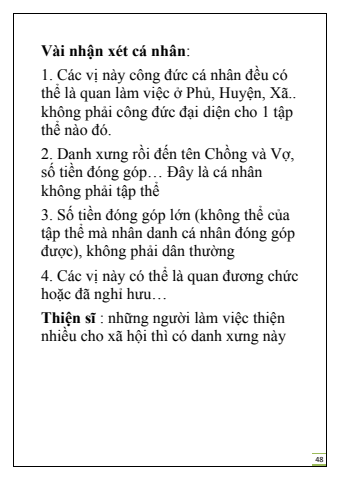 48V%u00e0i nh%u1eadn x%u00e9t c%u00e1 nh%u00e2n:1. C%u00e1c v%u1ecb n%u00e0y c%u00f4ng %u0111%u1ee9c c%u00e1 nh%u00e2n %u0111%u1ec1u c%u00f3 th%u1ec3 l%u00e0 quan l%u00e0m vi%u1ec7c %u1edf Ph%u1ee7, Huy%u1ec7n, X%u00e3.. kh%u00f4ng ph%u1ea3i c%u00f4ng %u0111%u1ee9c %u0111%u1ea1i di%u1ec7n cho 1 t%u1eadp th%u1ec3 n%u00e0o %u0111%u00f3.2. Danh x%u01b0ng r%u1ed3i %u0111%u1ebfn t%u00ean Ch%u1ed3ng v%u00e0 V%u1ee3, s%u1ed1 ti%u1ec1n %u0111%u00f3ng g%u00f3p%u2026 %u0110%u00e2y l%u00e0 c%u00e1 nh%u00e2n kh%u00f4ng ph%u1ea3i t%u1eadp th%u1ec33. S%u1ed1 ti%u1ec1n %u0111%u00f3ng g%u00f3p l%u1edbn (kh%u00f4ng th%u1ec3 c%u1ee7a t%u1eadp th%u1ec3 m%u00e0 nh%u00e2n danh c%u00e1 nh%u00e2n %u0111%u00f3ng g%u00f3p %u0111%u01b0%u1ee3c), kh%u00f4ng ph%u1ea3i d%u00e2n th%u01b0%u1eddng4. C%u00e1c v%u1ecb n%u00e0y c%u00f3 th%u1ec3 l%u00e0 quan %u0111%u01b0%u01a1ng ch%u1ee9c ho%u1eb7c %u0111%u00e3 ngh%u1ec9 h%u01b0u%u2026Thi%u1ec7n s%u0129 : nh%u1eefng ng%u01b0%u1eddi l%u00e0m vi%u1ec7c thi%u1ec7n nhi%u1ec1u cho x%u00e3 h%u1ed9i th%u00ec c%u00f3 danh x%u01b0ng n%u00e0y