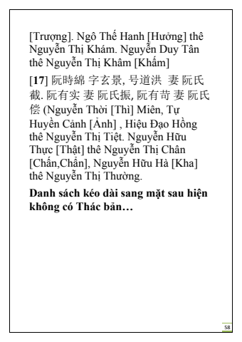 58[Tr%u01b0%u1ee3ng]. Ng%u00f4 Th%u1ebf Hanh [H%u01b0%u1edfng] th%u00ea Nguy%u1ec5n Th%u1ecb Kh%u00e1m. Nguy%u1ec5n Duy T%u00e2n th%u00ea Nguy%u1ec5n Th%u1ecb Kh%u00e2m [Kh%u1ea5m][17] %u962e%u6642%u7dbf %u5b57%u7384%u666f,%u53f7%u9053%u6d2a %u59bb %u962e%u6c0f%u622a. %u962e%u6709%u5b9e %u59bb %u962e%u6c0f%u632f, %u962e%u6709%u82db %u59bb %u962e%u6c0f%u507f (Nguy%u1ec5n Th%u1eddi [Th%u00ec] Mi%u00ean, T%u1ef1Huy%u1ec1n C%u1ea3nh [%u1ea2nh] , Hi%u1ec7u %u0110%u1ea1o H%u1ed3ng th%u00ea Nguy%u1ec5n Th%u1ecb Ti%u1ec7t. Nguy%u1ec5n H%u1eefu Th%u1ef1c [Th%u1eadt] th%u00ea Nguy%u1ec5n Th%u1ecb Ch%u00e2n [Ch%u1ea5n,Ch%u1ea9n], Nguy%u1ec5n H%u1eefu H%u00e0 [Kha] th%u00ea Nguy%u1ec5n Th%u1ecb Th%u01b0%u1eddng.Danh s%u00e1ch k%u00e9o d%u00e0i sang m%u1eb7t sau hi%u1ec7n kh%u00f4ng c%u00f3 Th%u00e1c b%u1ea3n%u2026
