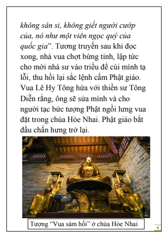 5kh%u00f4ng s%u00e2n si, kh%u00f4ng gi%u1ebft ng%u01b0%u1eddi c%u01b0%u1edbp c%u1ee7a, n%u00f3 nh%u01b0 m%u1ed9t vi%u00ean ng%u1ecdc qu%u00fd c%u1ee7a qu%u1ed1c gia%u201d. T%u01b0%u01a1ng truy%u1ec1n sau khi %u0111%u1ecdc xong, nh%u00e0 vua ch%u1ee3t b%u1eebng t%u1ec9nh, l%u1eadp t%u1ee9c cho m%u1eddi nh%u00e0 s%u01b0 v%u00e0o tri%u1ec1u %u0111%u1ec3 c%u00fai m%u00ecnh t%u1ea1l%u1ed7i, thu h%u1ed3i l%u1ea1i s%u1eafc l%u1ec7nh c%u1ea5m Ph%u1eadt gi%u00e1o. Vua L%u00ea Hy T%u00f4ng h%u1ee9a v%u1edbi thi%u1ec1n s%u01b0 T%u00f4ng Di%u1ec5n r%u1eb1ng, %u00f4ng s%u1ebd s%u1eeda m%u00ecnh v%u00e0 cho ng%u01b0%u1eddi t%u1ea1c b%u1ee9c t%u01b0%u1ee3ng Ph%u1eadt ng%u1ed3i l%u01b0ng vua %u0111%u1eb7t trong ch%u00f9a H%u00f2e Nhai. Ph%u1eadt gi%u00e1o b%u1eaft %u0111%u1ea7u ch%u1ea5n h%u01b0ng tr%u1edf l%u1ea1i. T%u01b0%u1ee3ng %u201cVua s%u00e1m h%u1ed1i%u201d %u1edf ch%u00f9a H%u00f2e Nhai