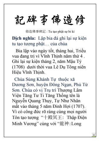 61%u8a18%u7891%u4e8b%u4f5b%u9020%u4fee%u4fee%u9020%u4f5b%u4e8b%u7891%u8a18 : Tu t%u1ea1o ph%u1eadt s%u1ef1 bi k%u00edD%u1ecbch ngh%u0129a: L%u1eadp bia %u0111%u00e1 ghi l%u1ea1i s%u1ef1 ki%u1ec7n tu t%u1ea1o t%u01b0%u1ee3ng ph%u1eadt%u2026 c%u1ee7a ch%u00f9a Bia l%u1eadp v%u00e0o ng%u00e0y t%u1ed1t, th%u00e1ng hai, Tri%u1ec1u vua %u0111ang tr%u1ecb v%u00ec V%u0129nh Th%u1ecbnh n%u0103m th%u1ee9 4 . Ghi l%u1ea1i s%u1ef1 ki%u1ec7n th%u00e1ng 2, n%u0103m M%u1eadu T%u00fd (1708) d%u01b0%u1edbi th%u1eddi vua L%u00ea D%u1ee5 T%u00f4ng ni%u00ean Hi%u1ec7u V%u0129nh Th%u1ecbnh. Ch%u00f9a S%u00f9ng Kh%u00e1nh T%u1ef1 thu%u1ed9c x%u00e3 D%u01b0%u01a1ng S%u01a1n, huy%u1ec7n %u0110%u00f4ng Ng%u1ea1n, Ph%u1ee7 T%u1eebS%u01a1n. Ch%u00f9a c%u00f3 v%u1ecb Tr%u1ee5 tr%u00ec Th%u01b0%u1ee3ng L%u00e2m Vi%u1ec7n T%u0103ng T%u01b0 Ti T%u0103ng Th%u1ed1ng t%u00ean l%u00e0 Nguy%u1ec5n Quang Th%u1ee5y, T%u1ef1 Nh%u01b0 Nh%u00e2n m%u1ea5t v%u00e0o th%u00e1ng 5 n%u0103m %u0110inh H%u1ee3i (1707). V%u00ec c%u00f3 c%u00f4ng %u0111%u1ee9c r%u00f5 r%u00e0ng c%u00f9ng m%u1ecdi ng%u01b0%u1eddi T%u00f4n t%u1ea1o t%u01b0%u1ee3ng %u201c%u5341%u6bbf%u51a5%u738b: Th%u1eadp %u0110i%u1ec7n Minh V%u01b0%u01a1ng%u201d c%u00f9ng v%u1edbi %u201c%u9f8d%u795e:Long