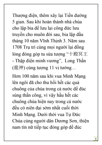 8Th%u01b0%u1ee3ng %u0111i%u1ec7n, th%u00eam x%u00e2y l%u1ea1i Ti%u1ec1n %u0111%u01b0%u1eddng 5 gian. Sau khi ho%u00e0n th%u00e0nh nh%u00e0 ch%u00f9a cho l%u1eadp bia %u0111%u1ec3 l%u01b0u l%u1ea1i c%u00f4ng %u0111%u1ee9c l%u01b0u truy%u1ec1n cho mu%u00f4n %u0111%u1eddi sau, bia l%u1eadp %u0111%u1ea7u th%u00e1ng 10 n%u0103m V%u0129nh Th%u1ecbnh 3. N%u0103m sau 1708 Tr%u1ee5 tr%u00ec c%u00f9ng m%u1ecdi ng%u01b0%u1eddi l%u1ea1i %u0111%u1ed3ng l%u00f2ng %u0111%u00f3ng g%u00f3p tu s%u1eeda t%u01b0%u1ee3ng %u201c%u5341%u6bbf%u51a5%u738b- Th%u1eadp %u0111i%u1ec7n minh v%u01b0%u01a1ng%u201d, Long Th%u1ea7n (%u9f8d%u795e) c%u00f9ng t%u01b0%u1ee3ng 11 v%u1ecb t%u01b0%u1edbng%u2026H%u01a1n 100 n%u0103m sau khi vua Minh M%u1ea1ng l%u00ean ng%u00f4i %u0111%u00e3 cho thu h%u1ed3i h%u1ebft c%u00e1c qu%u1ea3chu%u00f4ng c%u1ee7a ch%u00f9a trong c%u1ea3 n%u01b0%u1edbc %u0111%u1ec3 %u0111%u00fac s%u00fang th%u1ea7n c%u00f4ng, v%u00ec v%u1eady h%u1ea7u h%u1ebft c%u00e1c chu%u00f4ng ch%u00f9a hi%u1ec7n nay trong c%u1ea3 n%u01b0%u1edbc %u0111%u1ec1u c%u00f3 ni%u00ean %u0111%u1ea1i s%u1edbm nh%u1ea5t cu%u1ed1i th%u1eddi Minh M%u1ea1ng. D%u01b0%u1edbi th%u1eddi vua T%u1ef1 %u0110%u1ee9c Ch%u00f9a c%u00f9ng ng%u01b0%u1eddi d%u00e2n D%u01b0%u01a1ng S%u01a1n, thi%u1ec7n nam t%u00edn n%u1eef ti%u1ebfp t%u1ee5c %u0111%u00f3ng g%u00f3p %u0111%u1ec3 %u0111%u00fac